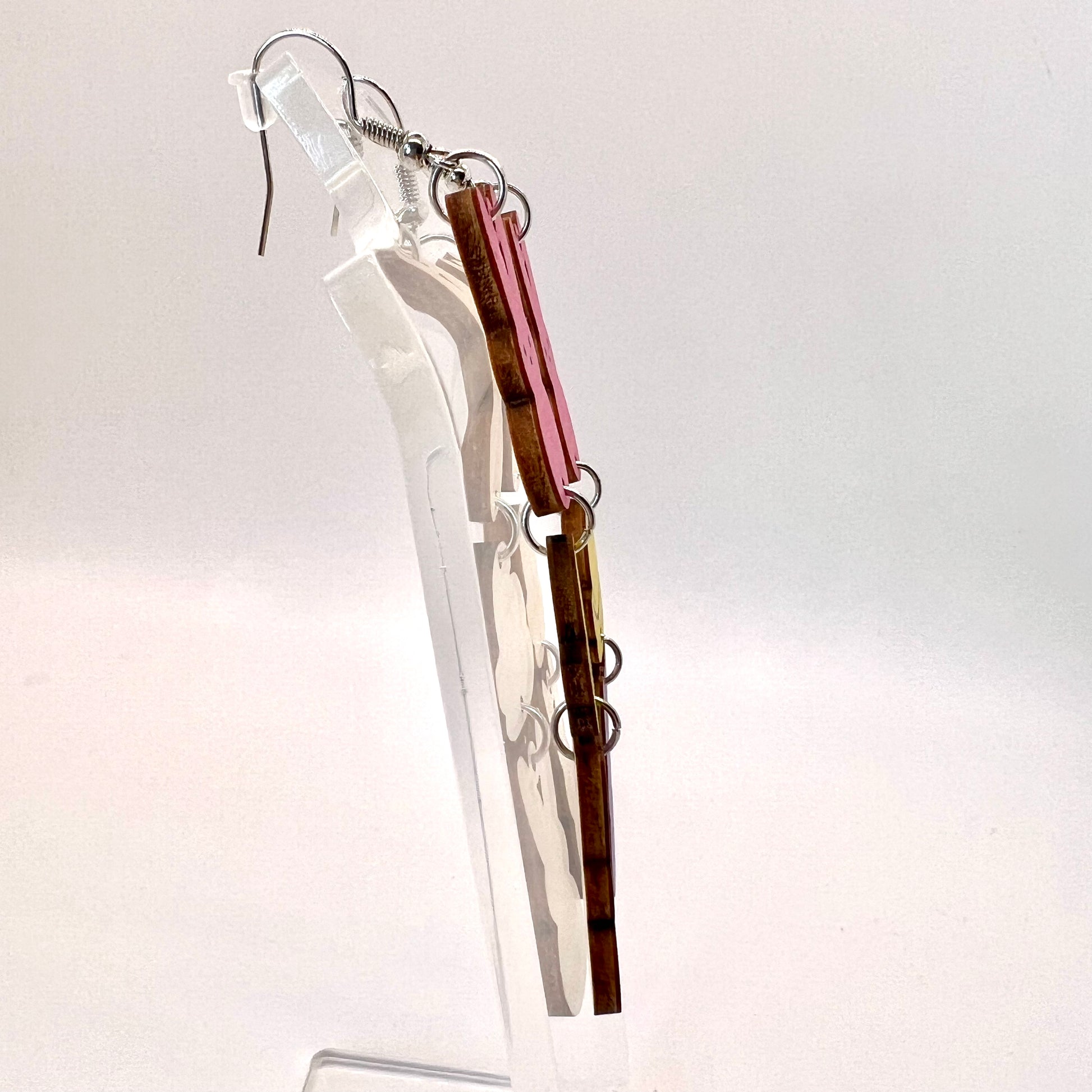 These earrings are made of wood with metal hooks.